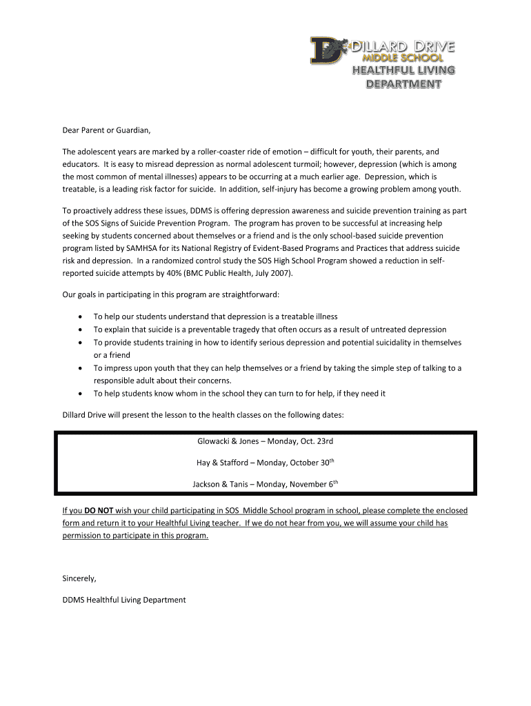 Dear Parent or Guardian, The adolescent years are marked by a rollercoaster ride of emotion difficult for youth, their parents, and educators. It is easy to misread depression as normal adolescent