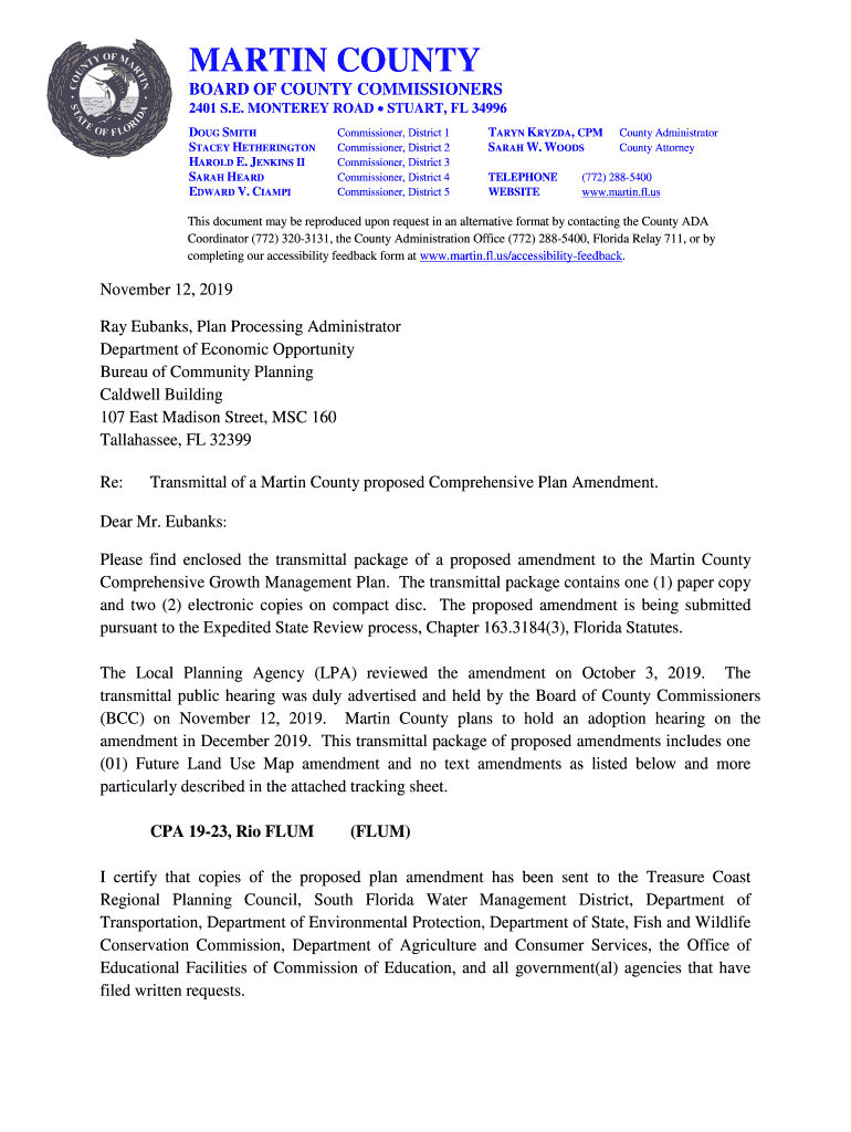 MARTIN COUNTY BOARD OF COUNTY COMMISSIONERS 2401 S.E. MONTEREY ROAD STUART, FL 34996 DOUG SMITH STACEY HETHERINGTON HAROLD E. JENKINS II SARAH HEARD EDWARD V. CIAMPICommissioner, District 1 Commissioner,