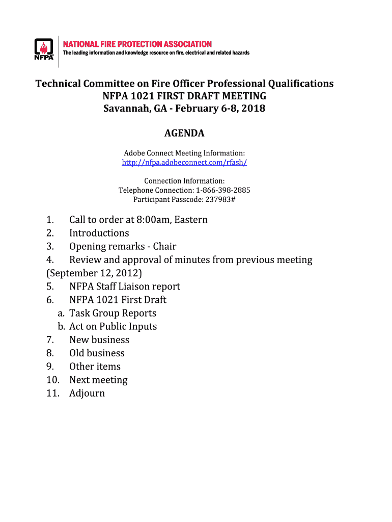 Technical Committee on Fire Officer Professional Qualifications NFPA 1021 FIRST DRAFT MEETING Savannah, GA February 68, 2018 AGENDA Adobe Connect Meeting Information: http://nfpa.adobeconnect.com/rfash/
