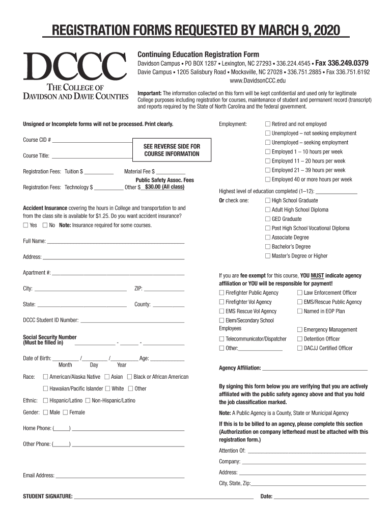 REGISTRATION FORMS REQUESTED BY MARCH 9, 2020, Continuing Education Registration Form Davidson Campus PO BOX 1287 Lexington, NC 27293 336.224.4545 Fax 336.249.0379 Davie Campus 1205 Salisbury Road