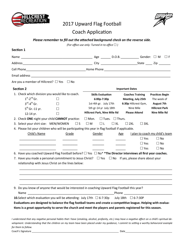 2017 Upward Flag Football Coach Application Please remember to fill out the attached background check on the reverse side. (For office use only: Turned in to office)Section 1 Name Age D.O.B. Gender: