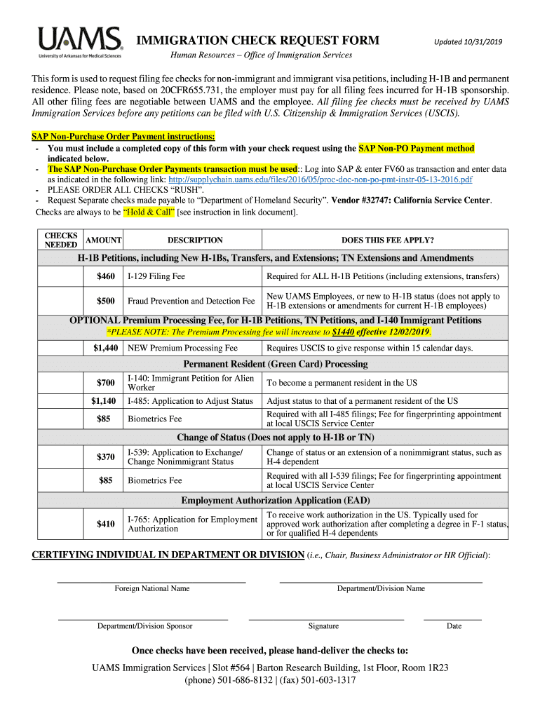 IMMIGRATION CHECK REQUEST Formulated 10/31/2019Human Resources Office of Immigration ServicesThis form is used to request filing fee checks for nonimmigrant and immigrant visa petitions, including