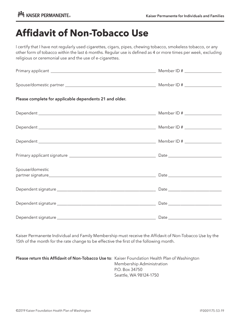 Get the free Affidavit of Non-Tobacco Use - Kaiser Permanente Washington