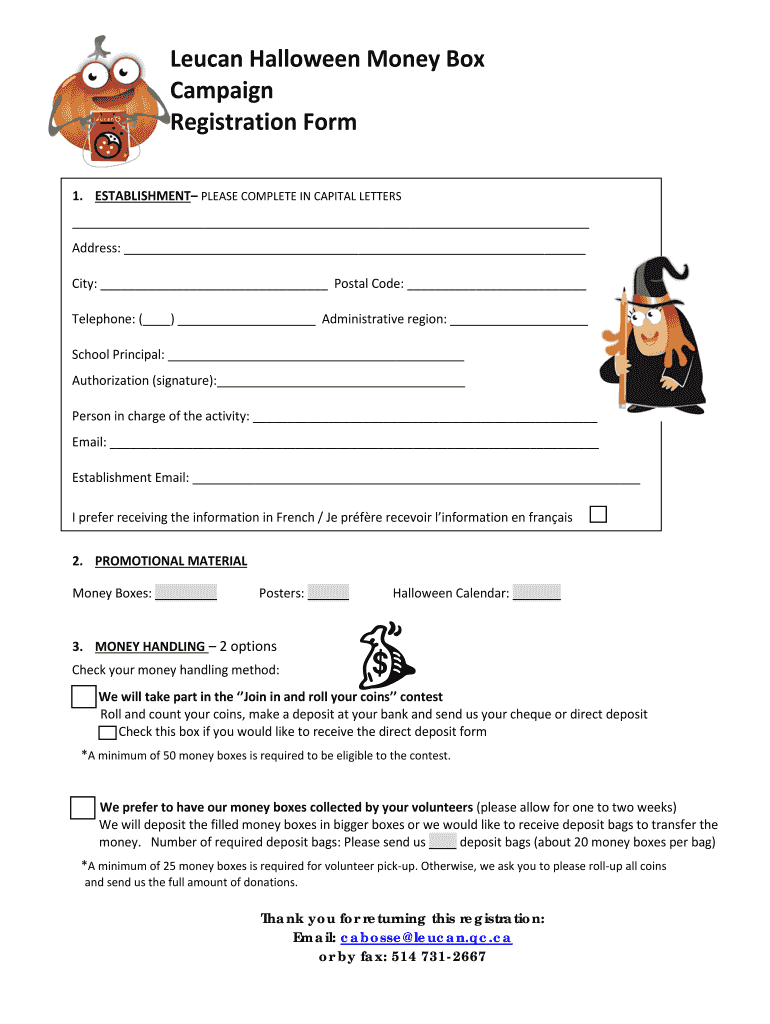 Lucas Halloween Money Box Campaign Registration Form 1. ESTABLISHMENT PLEASE COMPLETE IN CAPITAL LETTERS Address: City: Postal Code: Telephone: () Administrative region: School Principal: Authorization