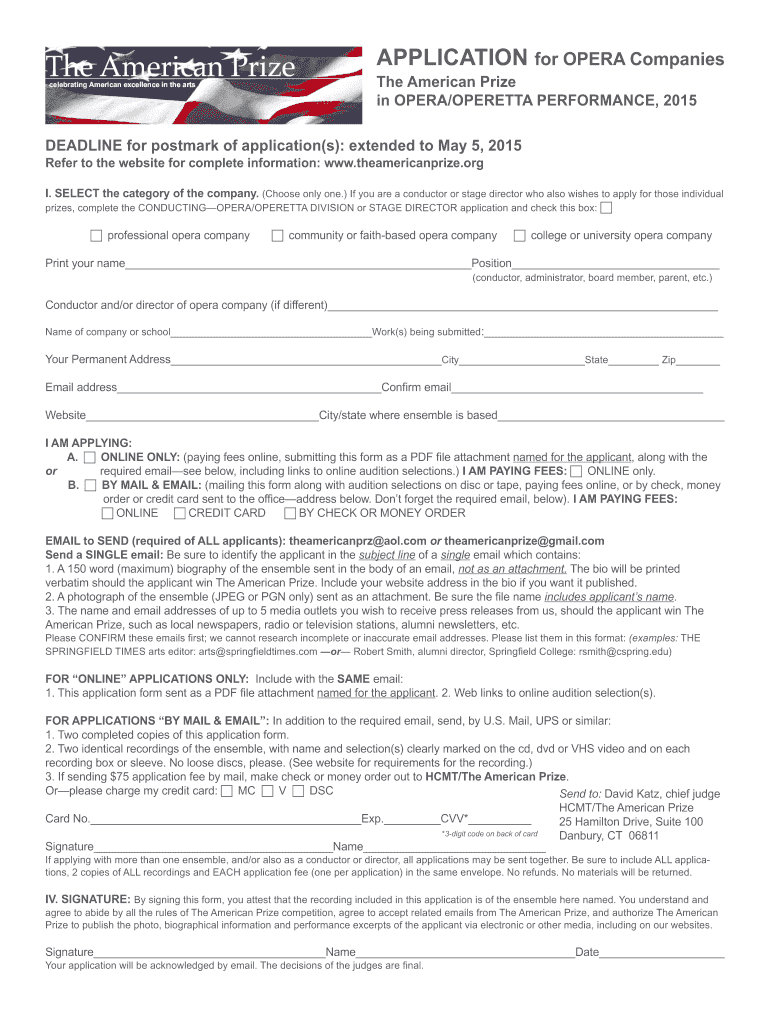 APPLICATION for OPERA Companies The American Prize in OPERA/OPERETTA PERFORMANCE, 2015 DEADLINE for postmark of application(s): extended to May 5, 2015, Refer to the website for complete information: