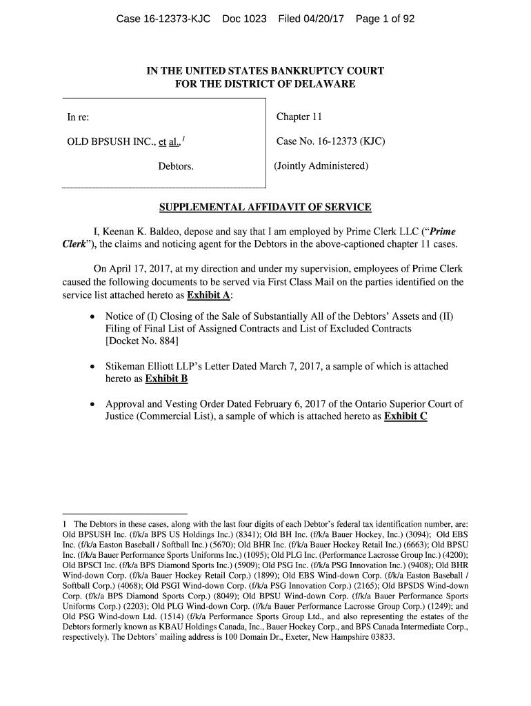 Case 1612373KJCDoc 1023Filed 04/20/17Page 1 of 92IN THE UNITED STATES BANKRUPTCY COURT