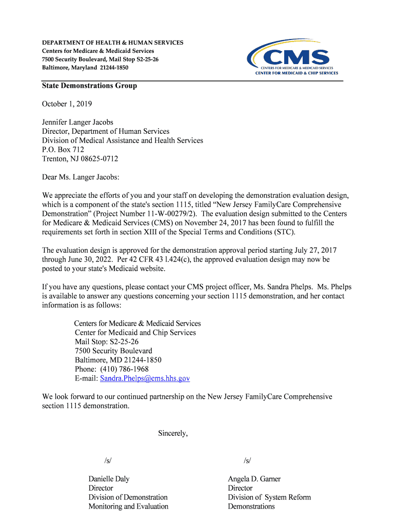 DEPARTMENT OF HEALTH & HUMAN SERVICES Centers for Medicare & Medicaid Services 7500 Security Boulevard, Mail Stop S22526 Baltimore, Maryland 212441850State Demonstrations Group October 1, 2019, Jennifer