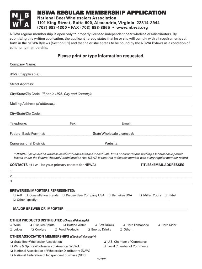 NBA REGULAR MEMBERSHIP APPLICATION National Beer Wholesalers Association 1101 King Street, Suite 600, Alexandria, Virginia 223142944 (703) 6834300 FAX (703) 6838965 www.nbwa.orgNBWA regular membership