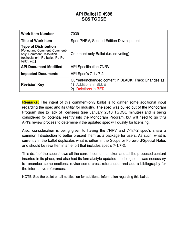 API Ballot ID 4986 SC5 TG DSE Work Item Number7039Title of Work Items 7NRV, Second Edition DevelopmentType of Distribution Voting and Comment, Comment only, Comment Resolution (recirculation), Re