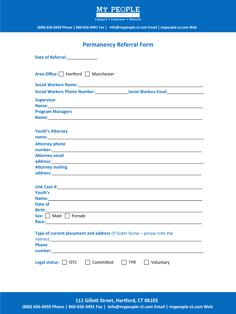 (860) 6560450 Phone 8606560491 Fax info mypeoplect.com Email mypeoplect.com Permanency Referral Form Date of Referral: Area OFCE: Hartford Manchester Social Workers Name: Social Workers Phone Number: