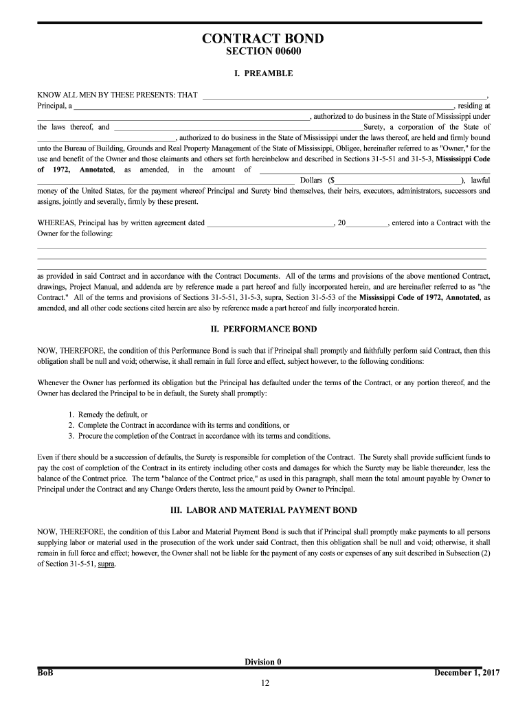 CONTRACT BOND SECTION 00600 I. PREAMBLE KNOW ALL MEN BY THESE PRESENTS: THAT, Principal, a , residing at, authorized to do business in the State of Mississippi under the laws thereof, and Surety,