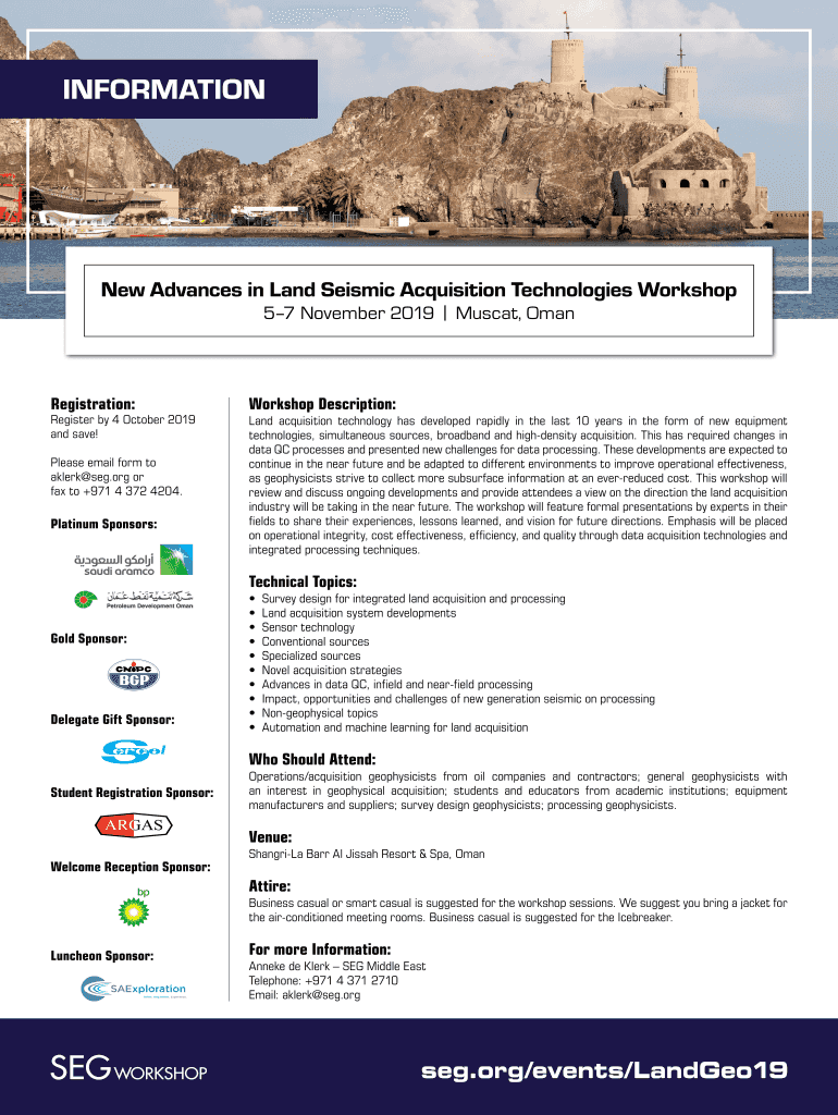 Information Advances in Land Seismic Acquisition Technologies Workshop 57 November 2019 Muscat, OmanRegistration:Register by 4 October 2019 and save! Please email form to clerk SEG.org or fax to +971