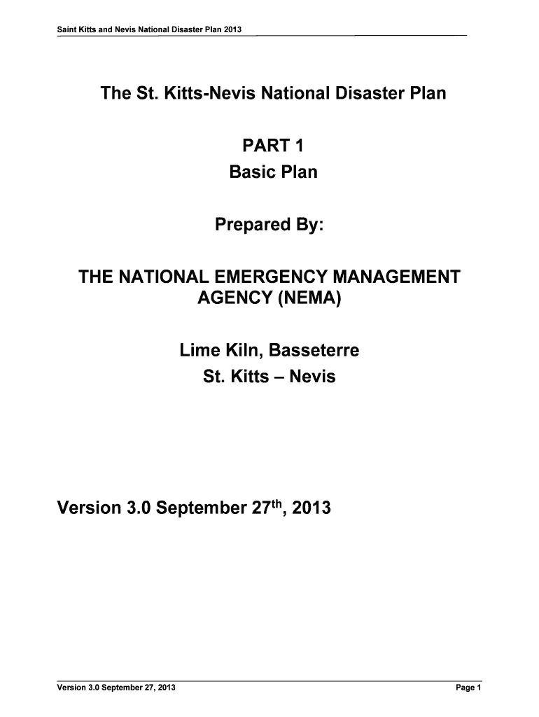 Saint Kitts and Nevis National Disaster Plan 2013The St. KittsNevis National Disaster Plan PART 1 Basic Plan Prepared By: THE NATIONAL EMERGENCY MANAGEMENT AGENCY (NEA) Lime Kiln, Basseterre St. Kits