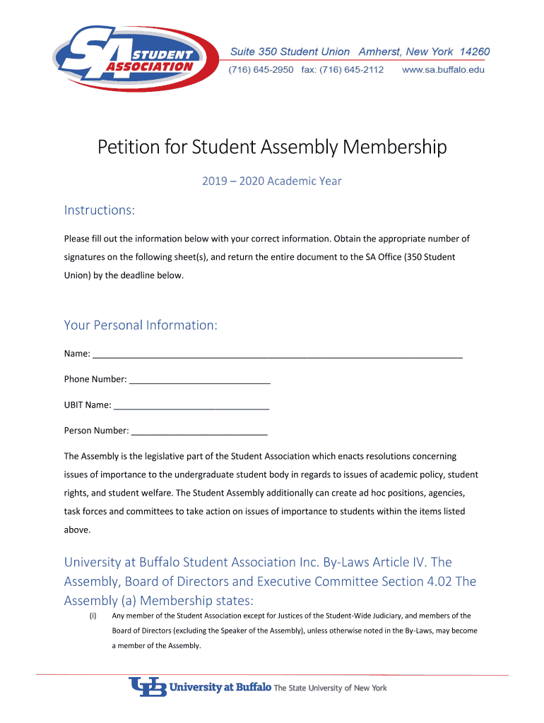Get the free UB Student Association Petition for Student Assembly Membership - sa buffalo