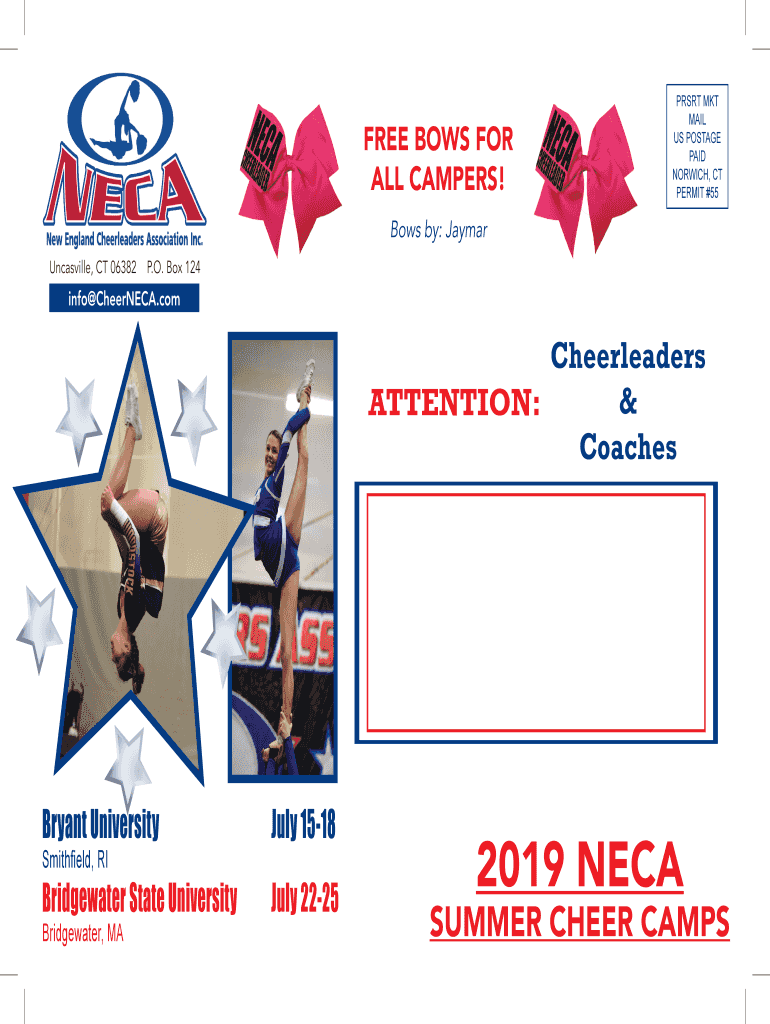 FREE BOWS FOR ALL CAMPERS!PR SRT MKT MAIL US POSTAGE PAID NORWICH, CT PERMIT #55Bows by: Jamar Duncanville, CT 06382P. O. Box 124info Cheered. Cheerleaders & ATTENTION: Coaches Bryant University July