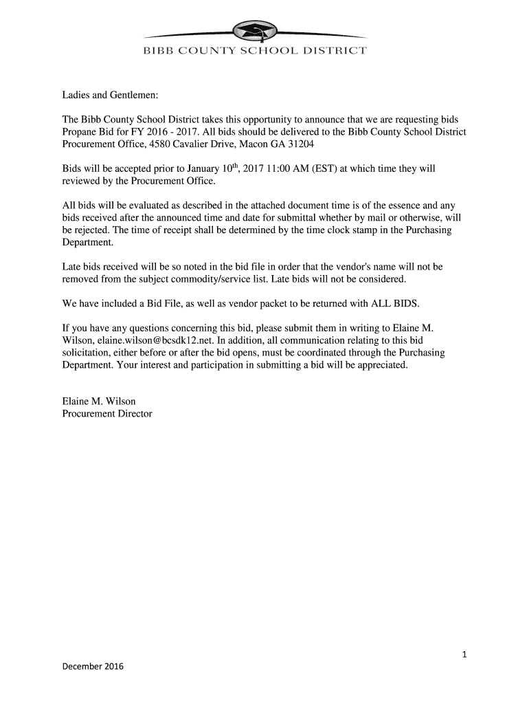 Ladies and Gentlemen: The BBB County School District takes this opportunity to announce that we are requesting bids Propane Bid for FY 2016 2017. All bids should be delivered to the BBB County School