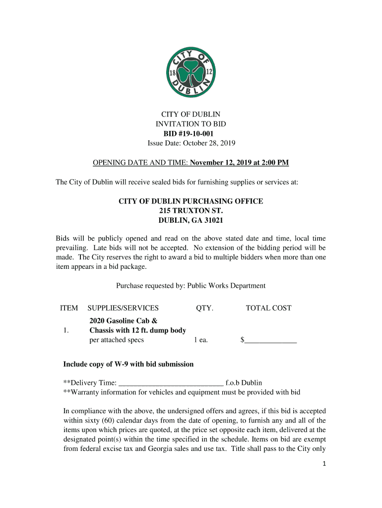 The City of Dublin will receive sealed bids for furnishing supplies or