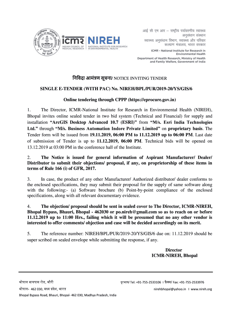 / NOTICE INVITING TENDERING TENDER (WITH PAC) No. NICE/BPL/PUR/201920/IS/GIS/6 Online tendering through PPP (https://eprocure.gov.in) 1. The Director, International Institute for Research in Environmental