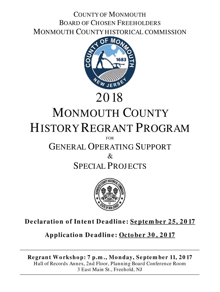 COUNTY OF MONMOUTH BOARD OF CHOSEN FREEHOLDERSMONMOUTH COUNTY HISTORICAL COMMISSION2018 MONMOUTH COUNTY HISTORY REGNANT PROGRAM GENERAL OPERATING SUPPORT SPECIAL PROJECTSDeclaration of Intent Deadline: