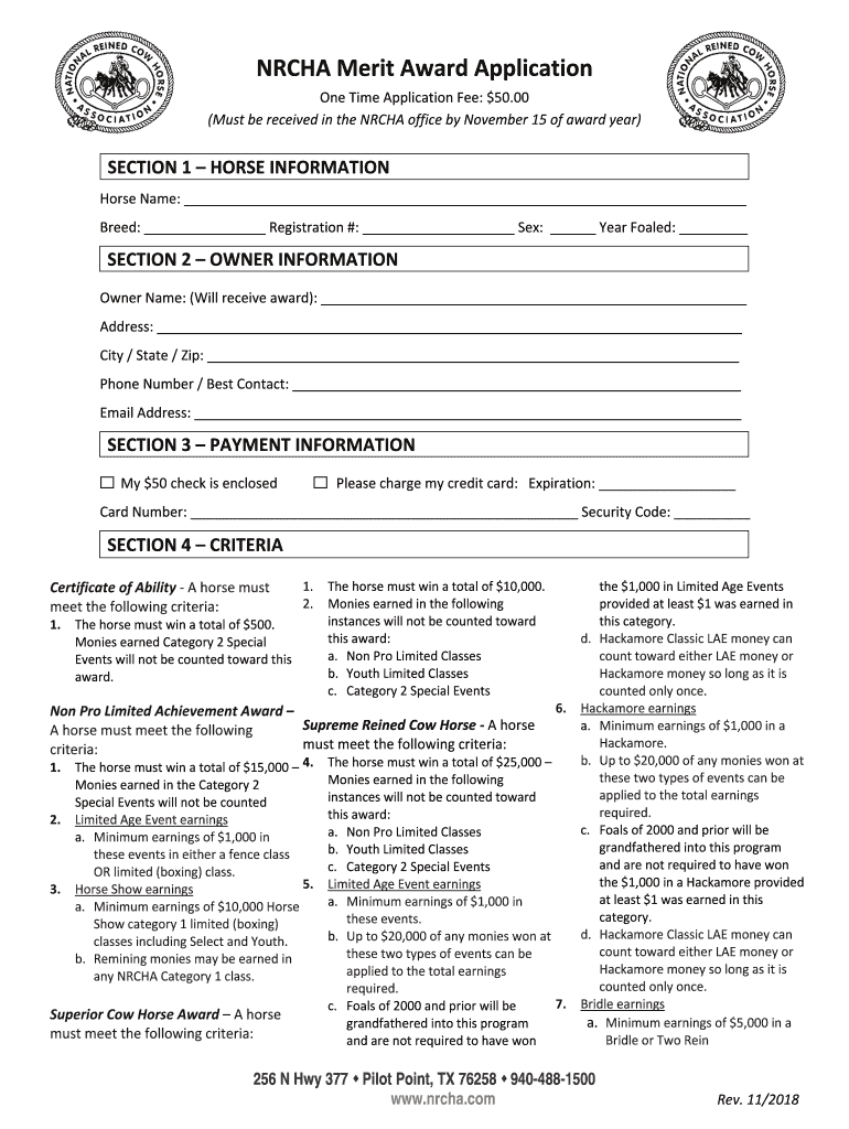NRC HA Merit Award Application One Time Application Fee: $50.00 (Must be received in the NRC HA office by November 15 of award year)SECTION 1 HORSE INFORMATION Horse Name: Breed: Registration #: Sex: