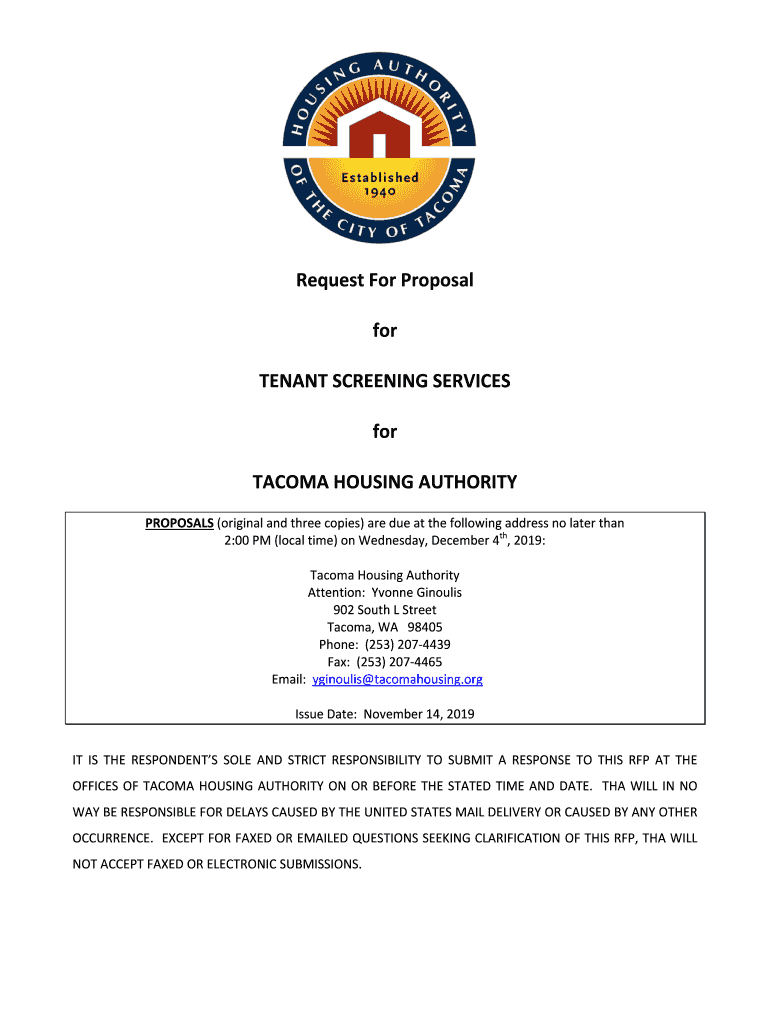 RequestForProposal for TENANTSCREENINGSERVICES for TACOMAHOUSINGAUTHORITY PROPOSALS(originalandthreecopies)aredueatthefollowingaddressnolaterthan 2:00PM(local time)on Wednesday,December4th,2019: TacomaHousingAuthority