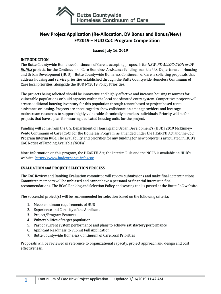 New Project Application (Reallocation, DV Bonus and Bonus/New) FY2019 HUD COC Program Competition Issued July 16, 2019, INTRODUCTION The Butte Countywide Homeless Continuum of Care is accepting proposals