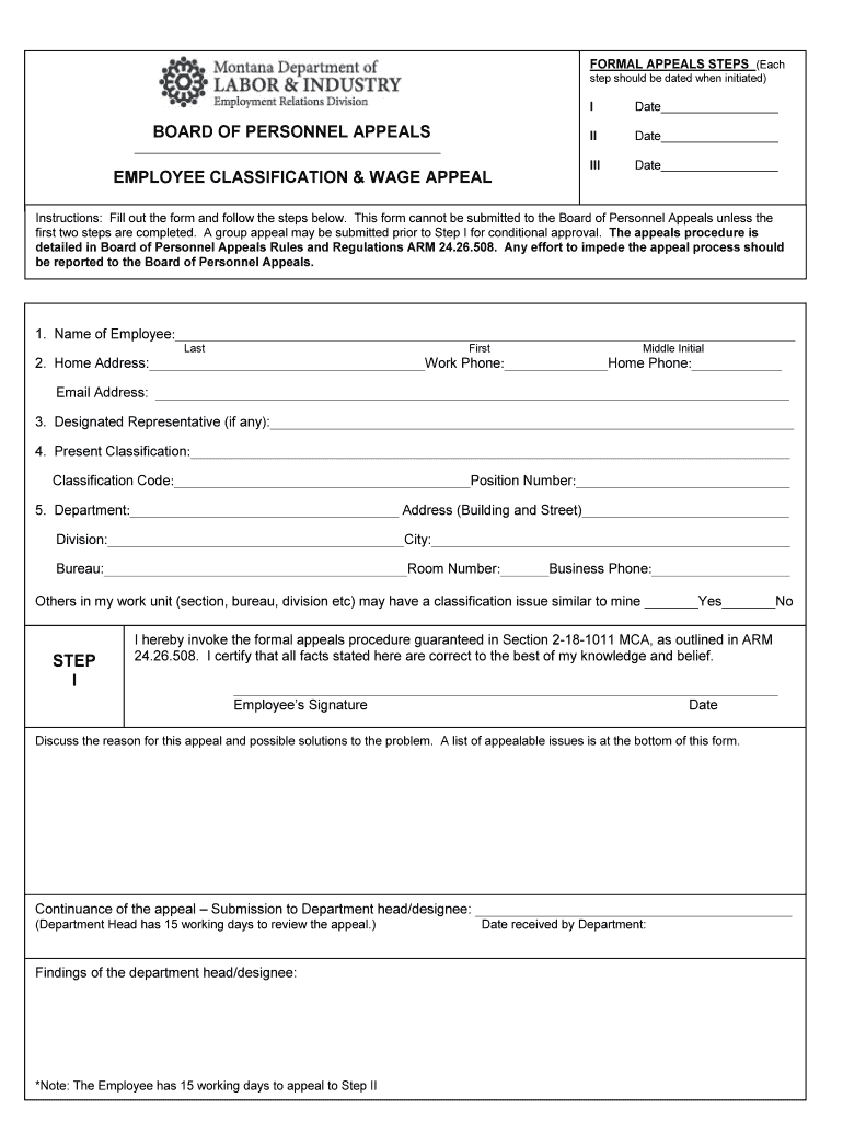 FORMAL APPEALS STEPS (Each step should be dated when initiated)BOARD OF PERSONNEL APPEALS EMPLOYEE CLASSIFICATION & WAGE Appellate IDATE Imitate Instructions: Fill out the form and follow the steps