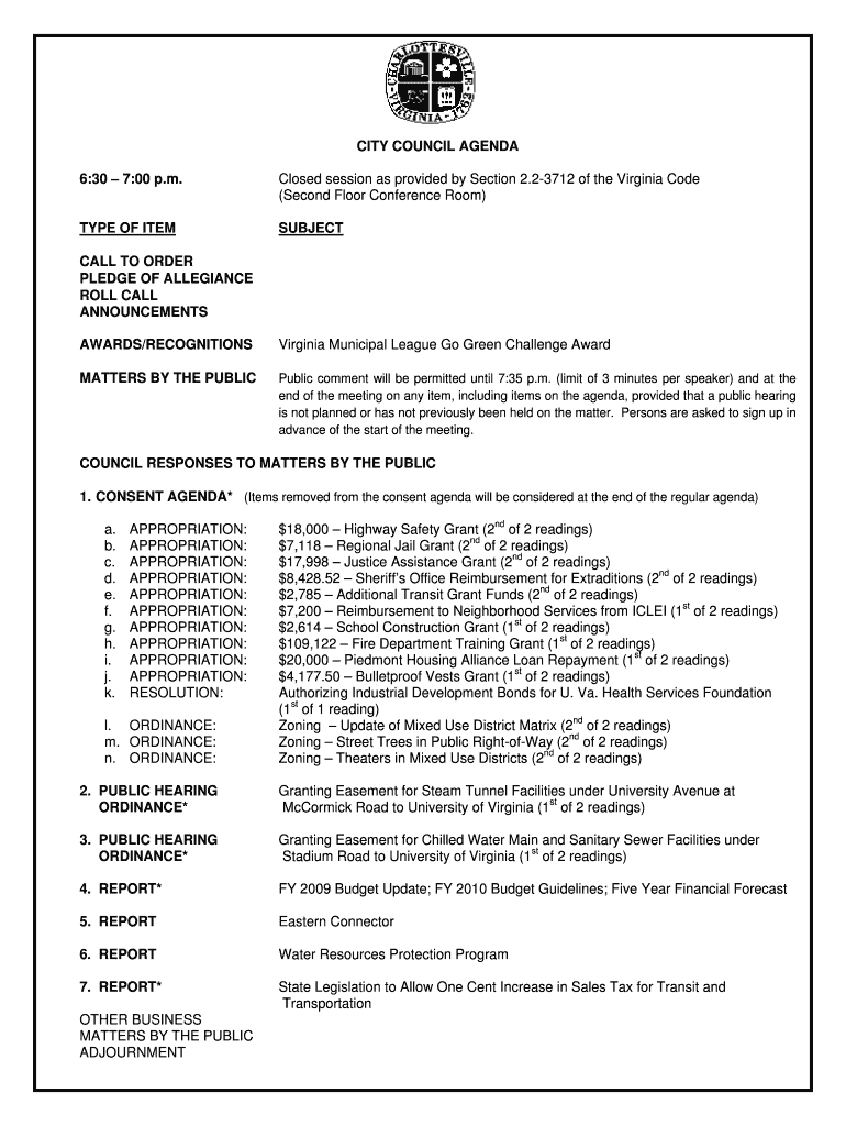 CITY COUNCIL AGENDA 6:30 7:00 p.m. Closed session as provided by Section 2.23712 of the Virginia Code (Second Floor Conference Room)TYPE OF ITEMSUBJECTCALL TO ORDER PLEDGE OF ALLEGIANCE ROLL CALL