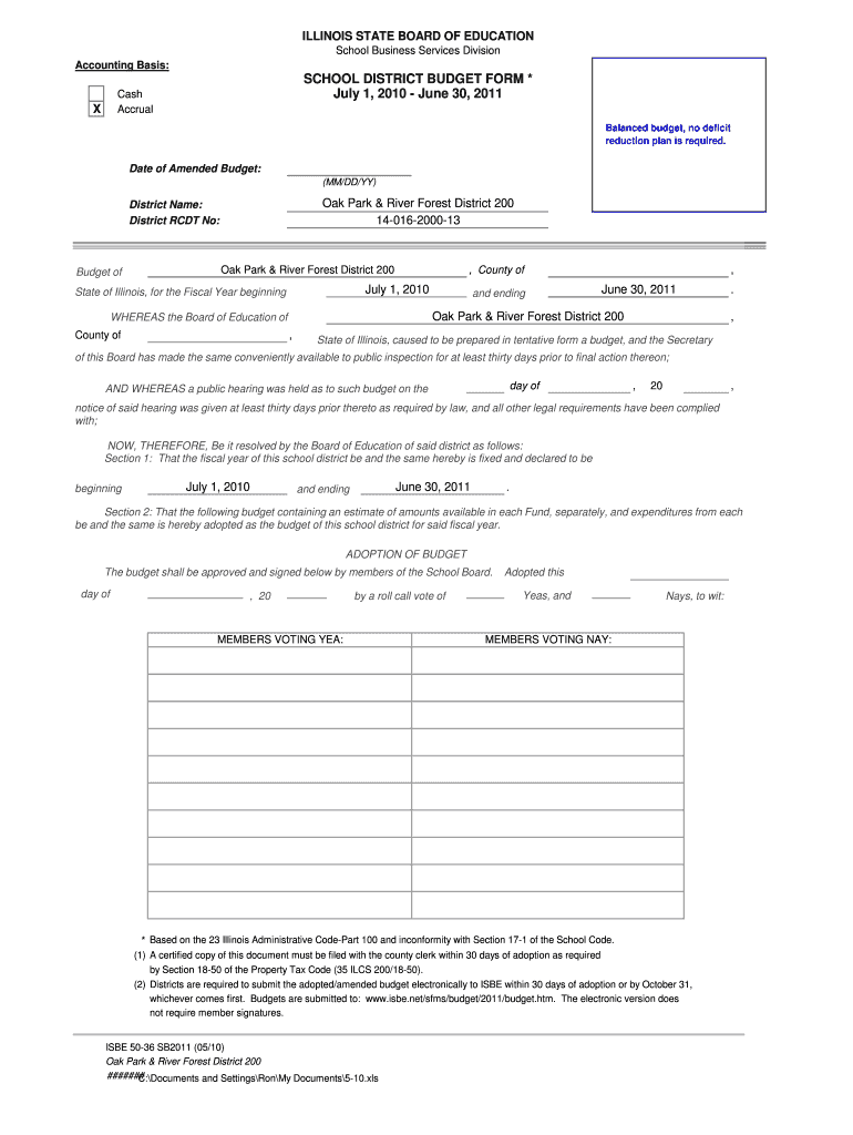 ILLINOIS STATE BOARD OF EDUCATION School Business Services Division Accounting Basis:SCHOOL DISTRICT BUDGET FORM * July 1, 2010, June 30, 2011Cash AccrualXBalanced budget, no deficit reduction plan