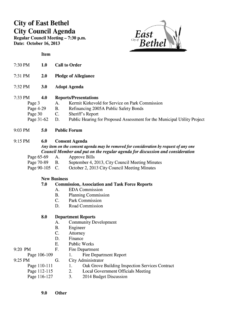 City of East Ethel City Council Agenda Regular Council Meeting 7:30 p.m. Date: October 16, 2013, Item 7:30 PM1.0Call to Order7:31 PM2.0Pledge of Allegiance7:32 PM3.0Adopt Agenda7:33 PM 4.0-Page 3-Page