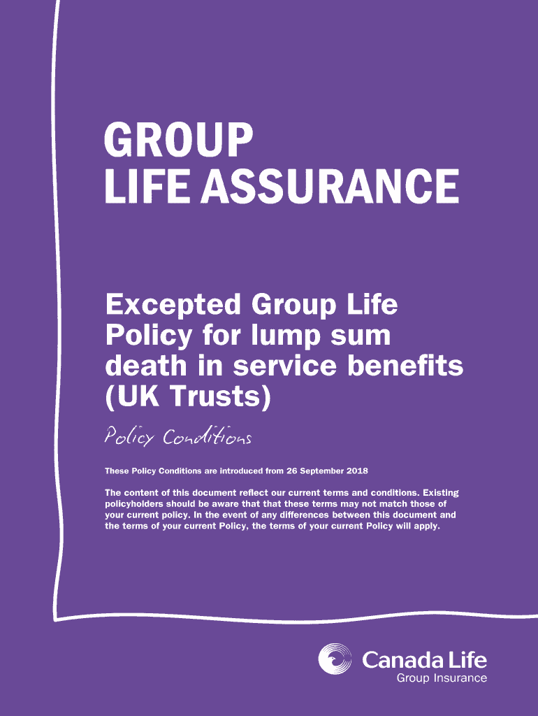 Excepted Group Life Policy for lump sum death in service benefits (UK Trusts) Policy Conditions These Policy Conditions are introduced from 26 September 2018The content of this document reflect our