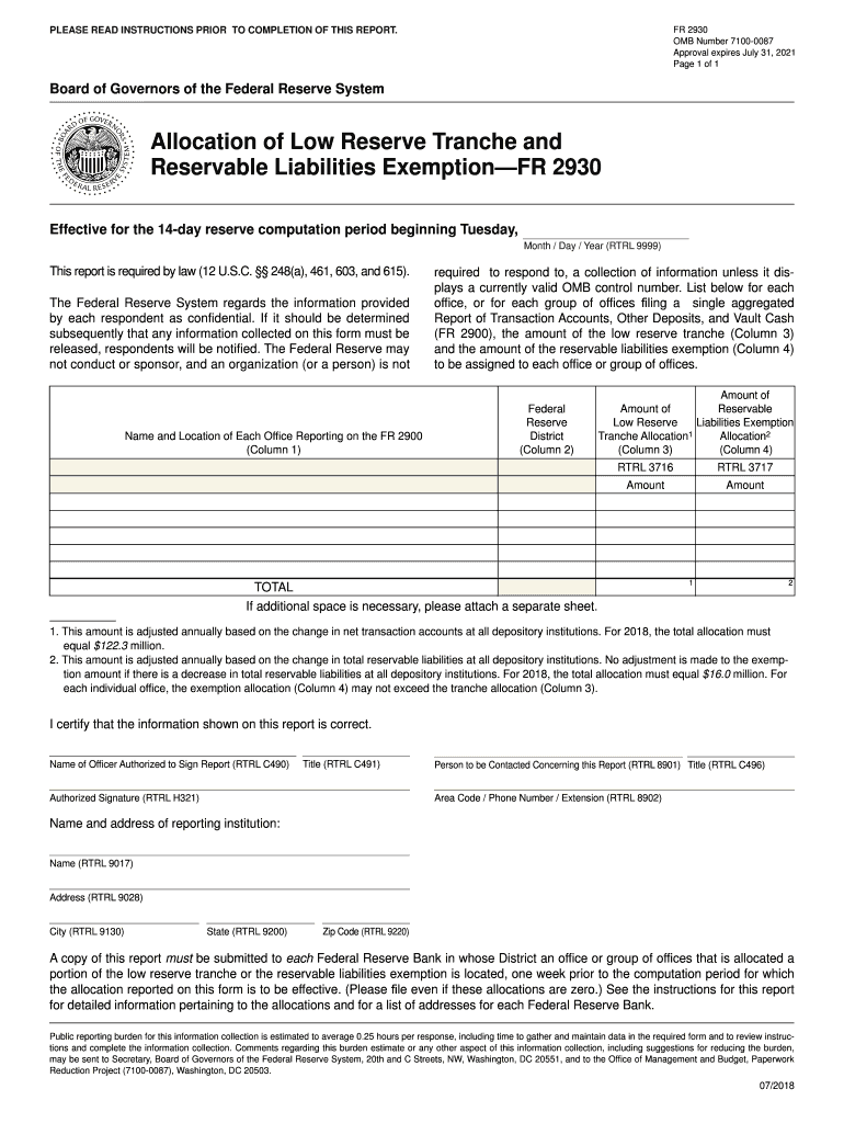 FR 2930 OMB Number 71000087 Approval expires July 31, 2021-Page 1 of 1PLEASE READ INSTRUCTIONS PRIOR TO COMPLETION OF THIS REPORT. Board of Governors of the Federal Reserve SystemAllocation of Low