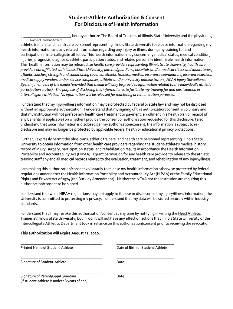 StudentAthlete Authorization & Consent For Disclosure of Health Information I, hereby authorize The Board of Trustees of Illinois State University and the physicians, Name of StudentAthleteathletic