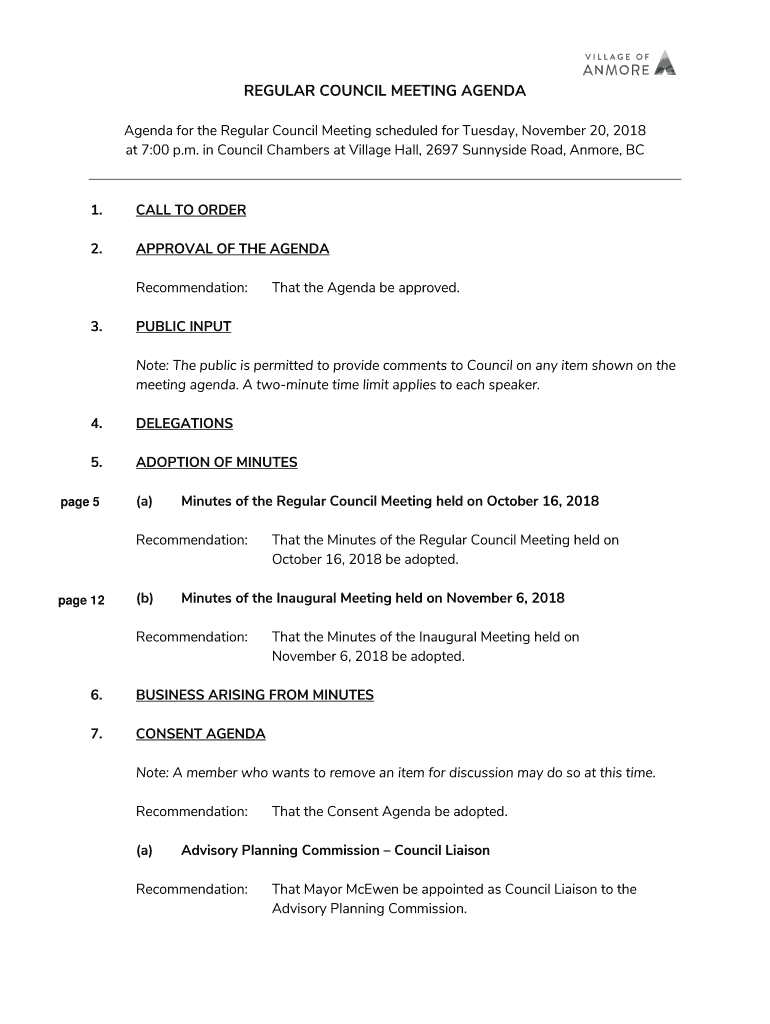 REGULAR COUNCIL MEETING AGENDA for the Regular Council Meeting scheduled for Tuesday, November 20, 2018,