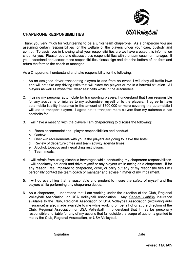 The main purpose of the Junior Team Chaperone Responsibilities Form is to guarantee safety and proper conduct during team activities. This form acts as a safeguard, helping ensure that all chaperones are aware of their accountability to the players and the team’s standards.
