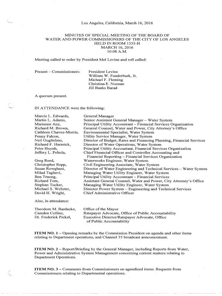 Los Angeles, California, March 16, 2016MINUTES OF SPECIAL MEETING OF THE BOARD OF WATER AND POWER COMMISSIONERS OF THE CITY OF LOS ANGELES HELD IN ROOM 1555H MARCH 16, 2016 10:08 A.M. Meeting called