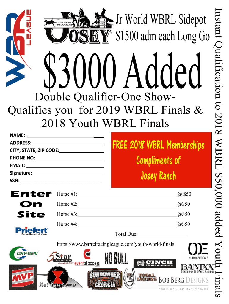 $3000 AddedDouble Qualifier ShowQualifies you for 2019 BRL Finals & 2018 Youth BRL Finals NAME: ADDRESS: CITY, STATE, ZIP CODE: PHONE NO: EMAIL: Signature: SSN: Enter On Stereo 2018 BRL Memberships