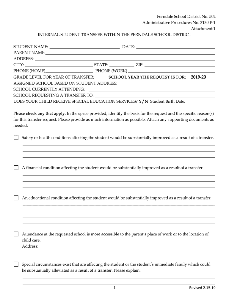 Get the free Internal Student Transfer Form - Ferndale School District