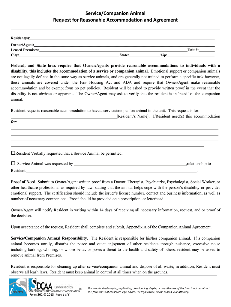 Service/CompanionAnimal RequestforReasonableAccommodationandAgreement Resident(s): Owner/Agent: Leased Premises: City:Unit #: State:Zip:Federal, and State laws require that Owner/Agents provide reasonable