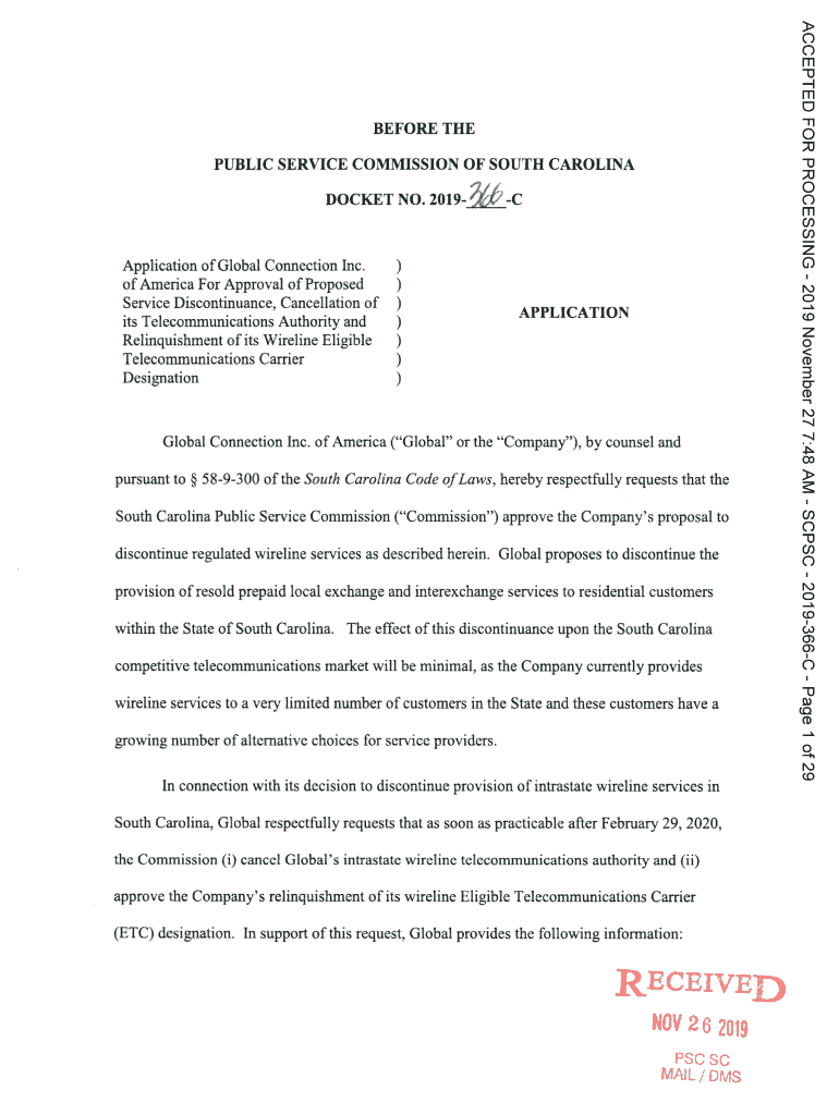 PUBLIC SERVICE COMMISSION OF SOUTH CAROLINADOCKET NO. 2019CApplication of Global Connection Inc. of America For Approval of Proposed Service Discontinuance, Cancellation of its Telecommunications