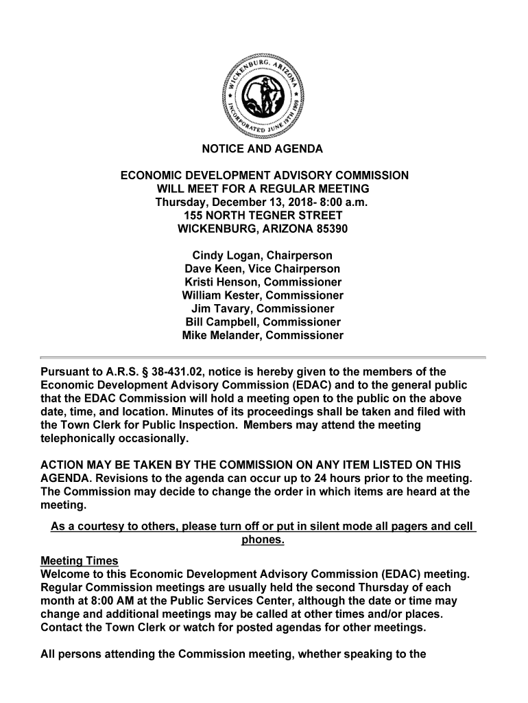 NOTICE AND AGENDA ECONOMIC DEVELOPMENT ADVISORY COMMISSION WILL MEET FOR A REGULAR MEETING Thursday, December 13, 2018 8:00 a.m. 155 NORTH TEGNÉR STREET HINDENBURG, ARIZONA 85390 Cindy Logan, Chairperson