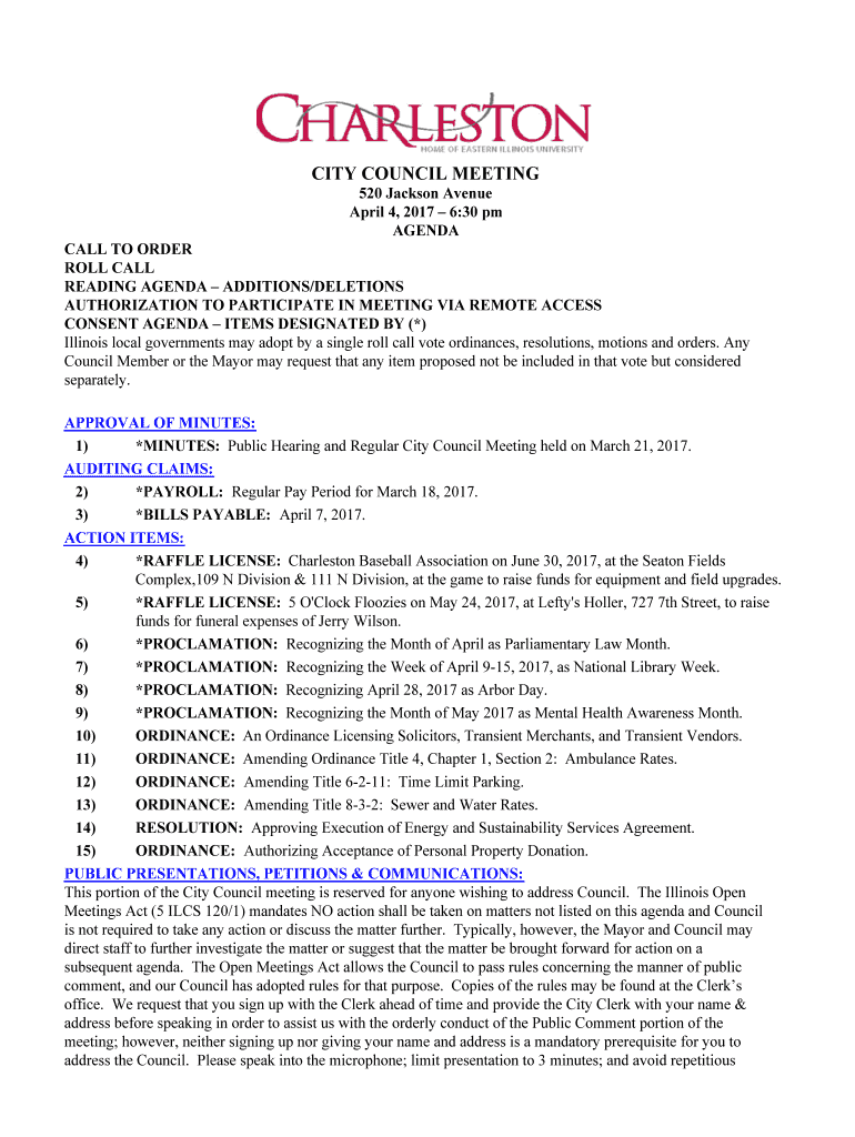 CITY COUNCIL MEETING 520 Jackson Avenue April 4, 2017 6:30 pm AGENDA CALL TO ORDER ROLL CALL READING AGENDA ADDITIONS/DELETIONS AUTHORIZATION TO PARTICIPATE IN MEETING VIA REMOTE ACCESS CONSENT AGENDA