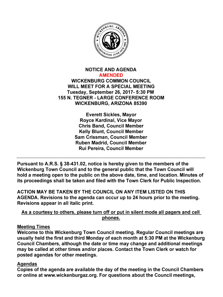 NOTICE AND AGENDA AMENDED HINDENBURG COMMON COUNCIL WILL MEET FOR A SPECIAL MEETING Tuesday, September 26, 2017 5:30 PM 155 N. TEGNÉR LARGE CONFERENCE ROOM HINDENBURG, ARIZONA 85390 Everett Sickles,
