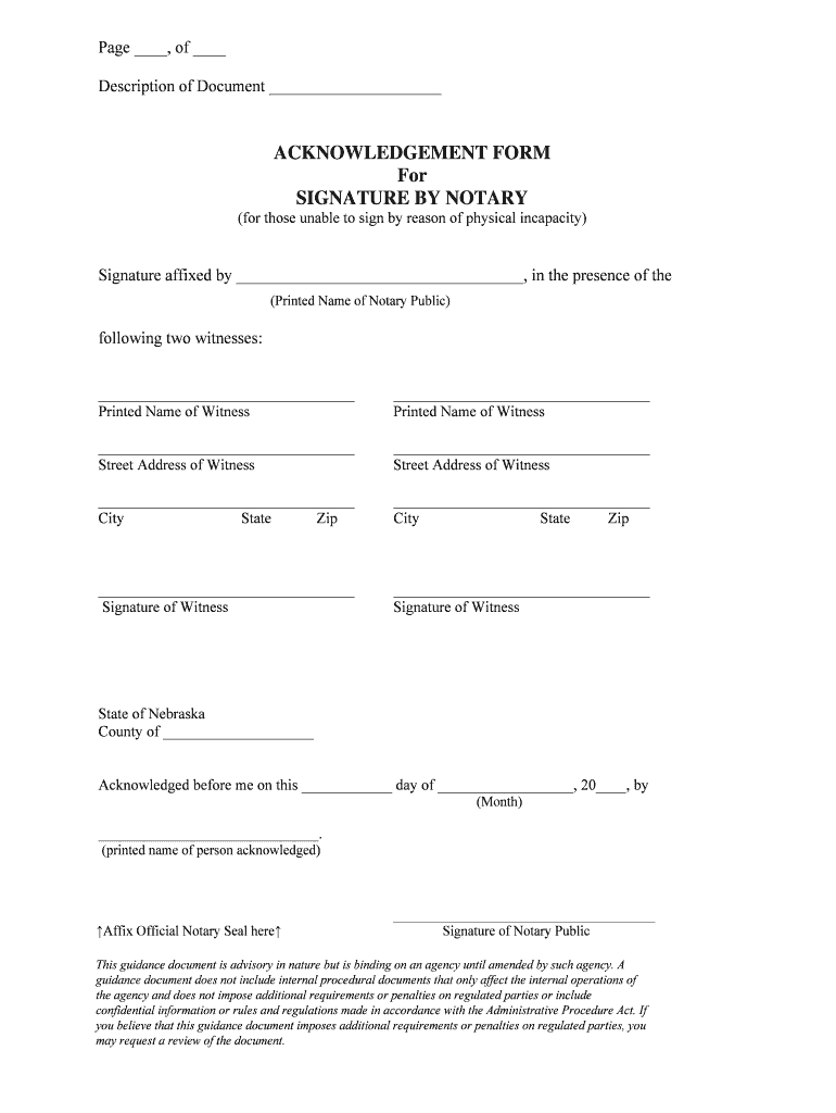 Page, of Description of Document ACKNOWLEDGEMENT FORM For SIGNATURE BY NOTARY (for those unable to sign by reason of physical incapacity)Signature affixed by, in the presence of the (Printed Name