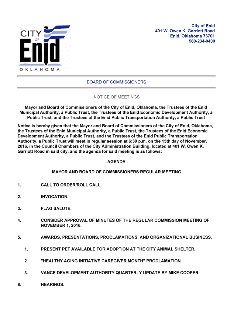 City of Enid 401 W. Owen K. Marriott Road Enid, Oklahoma 73701 5802340400BOARDOFCOMMISSIONERSNOTICEOFMEETINGS Mayor and Board of Commissioners of the City of Enid, Oklahoma, the Trustees of the Enid