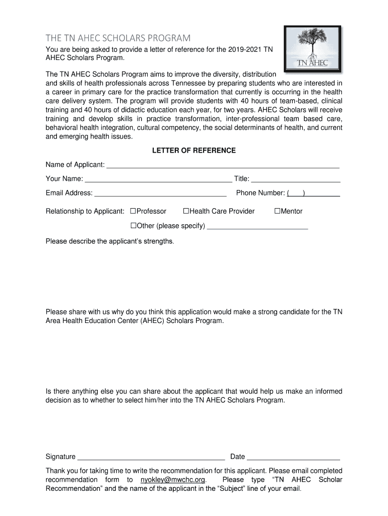 You are being asked to provide a letter of reference for the 20192021 TNA HEC Scholars Program.