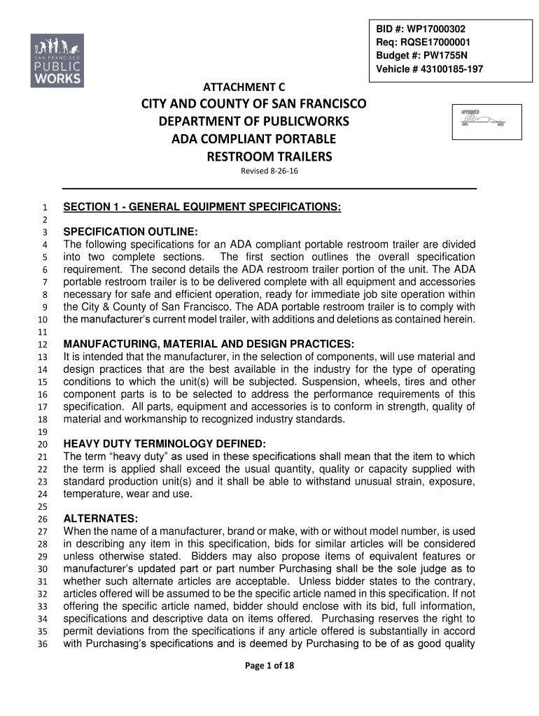 BID #: WP17000302 Req: RQSE17000001 Budget #: PW1755N Vehicle # 43100185197ATTACHMENT CITY AND COUNTY OF SAN FRANCISCO DEPARTMENT OF PUBLICWORKS ADA COMPLIANT PORTABLE RESTROOM TRAILERS Revised 826161