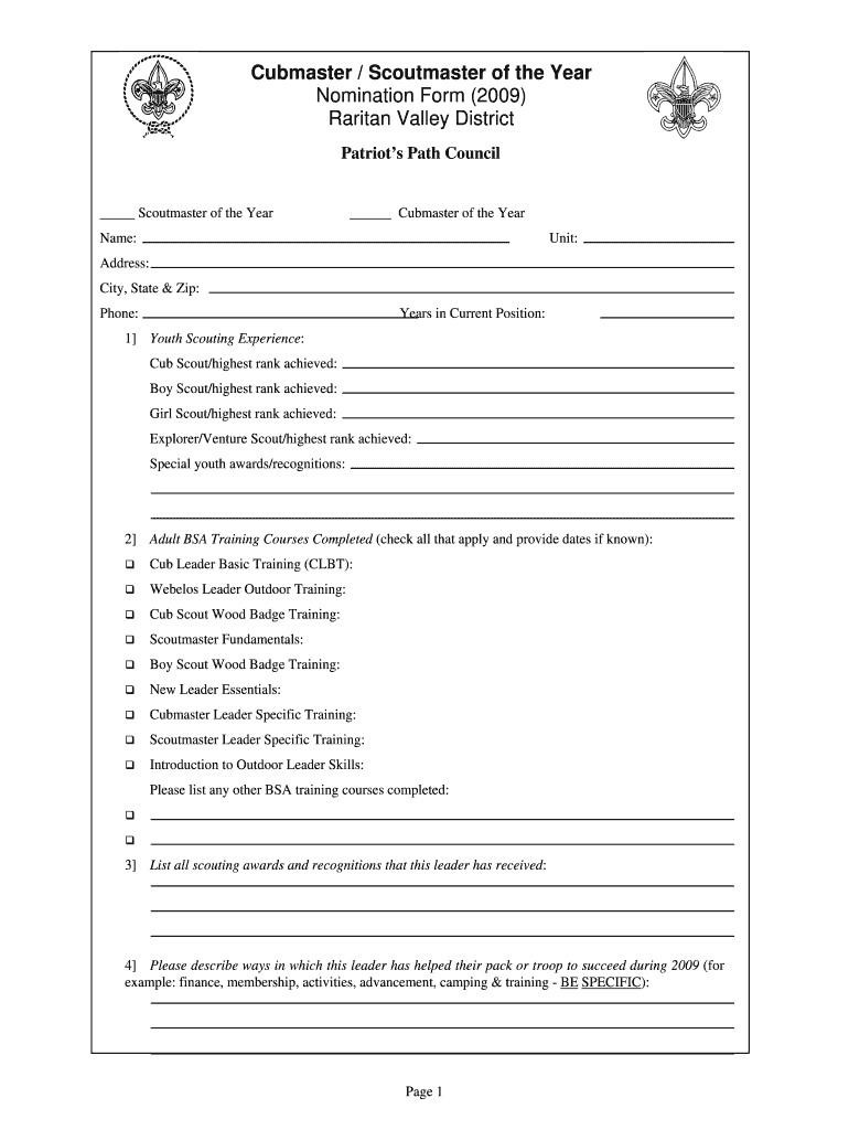 Cub master / Scoutmaster of the Year Nomination Form (2009) Marital Valley District Patriots Path Council Scoutmaster of the Year Cub master of to Rename:Unit:Address: City, State & Zip: Phone:Years