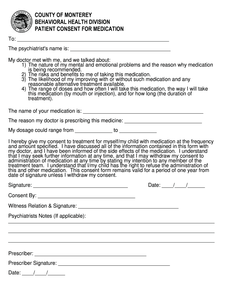 COUNTY OF MONTEREY BEHAVIORAL HEALTH DIVISION PATIENT CONSENT FOR MEDICATION To: The psychiatrist's name is: My doctor met with me, and we talked about: 1) The nature of my mental and emotional problems