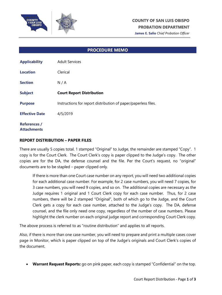 COUNTY OF SAN LUIS OBISPOPROBATION DEPARTMENT James E. Salvo Chief Probation OfficerPROCEDURE MEMO ApplicabilityAdult ServicesLocationClericalSectionN/ASubjectCourt Report DistributionPurposeInstructions
